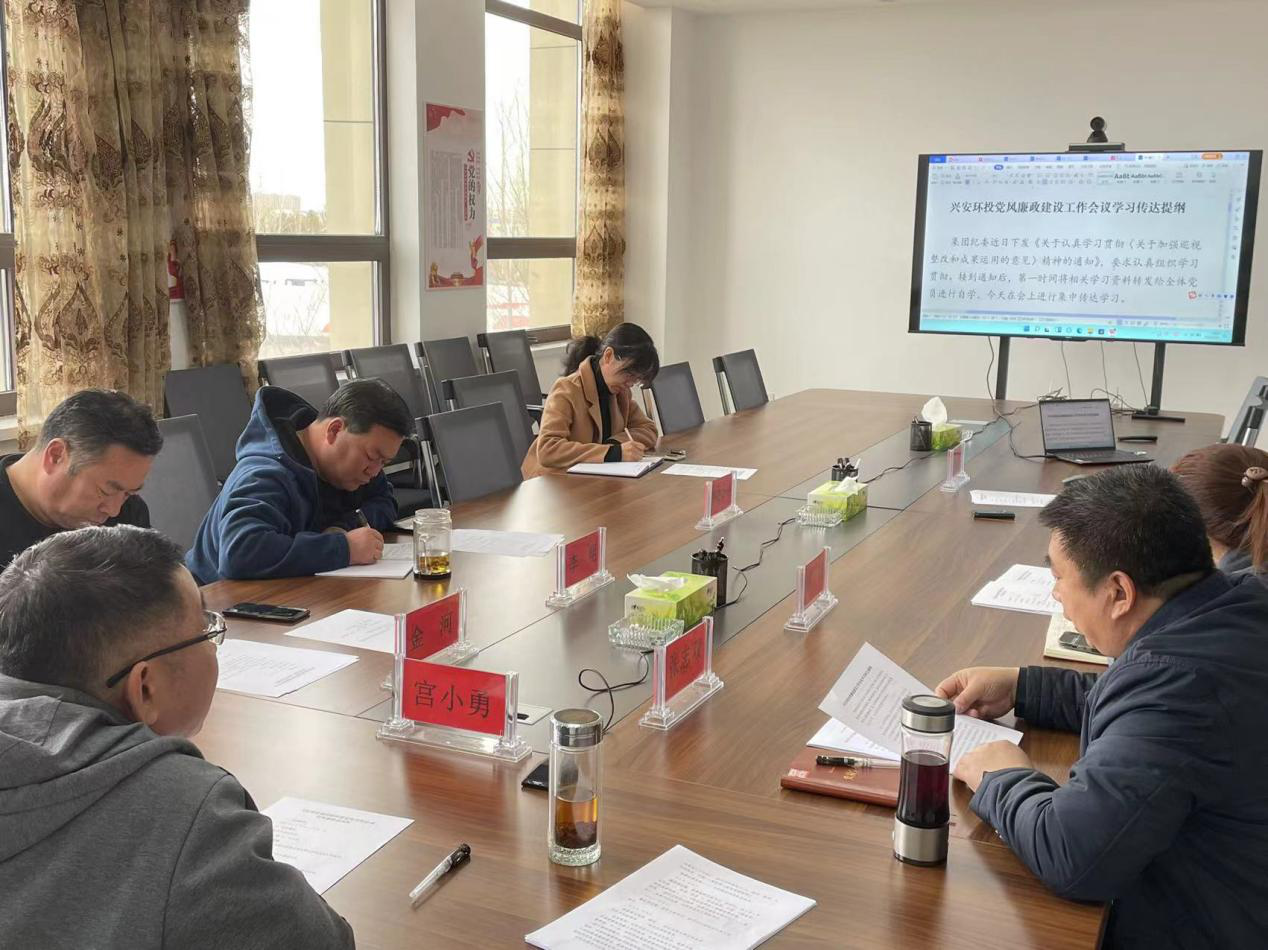 党支部书记、董事长宫小勇就公司党风廉政建设工作进行安排部署。围绕“怎么看、怎么办”,首先分析研判了当前反腐倡廉工作形势,要求深入贯彻落实党风廉政建设,切实转变工作作风。他强调兴安环投公司党风廉政建设重点要在一体推进“不敢腐、不能腐、不想腐”上下功夫。通过学习正面典型和反面典型案例,警钟长鸣做到“不敢腐”。切实梳理廉政风险点,健全完善规章制度,强化措施“不能腐”;加强教育引导,锻造一支风气正、战斗力强、素质稳步提升的队伍,不断增强“不想腐”的政治自觉、思想自觉、行动自觉。