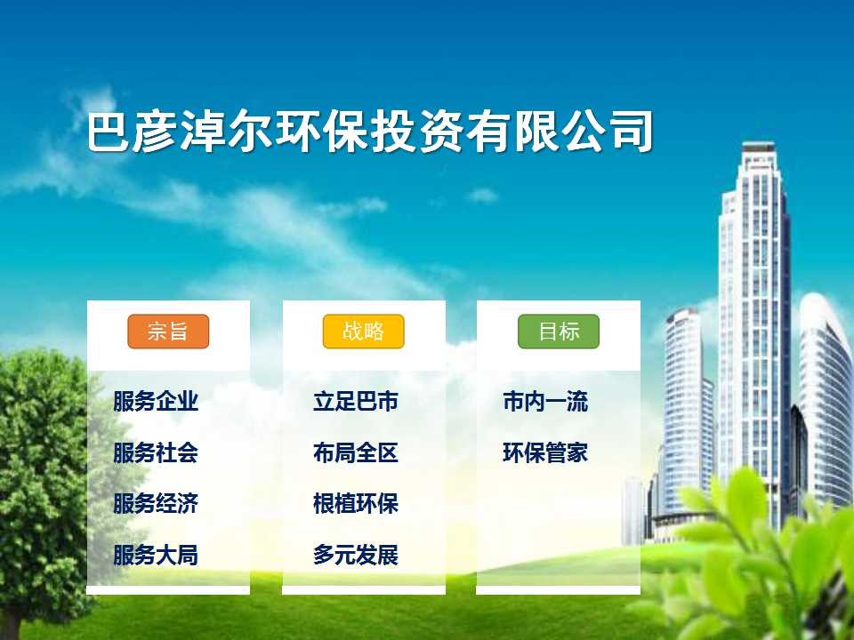 巴彦淖尔环保投资有限公司是内蒙古环保投资集团有限公司(“内蒙古环投”)和内蒙古鑫诺环境工程技术咨询有限公司于2018年4月2日组建的国有控股公司,公司以环境基础服务为主业,拓展环境治理工程、生态环境大数据服务项目,致力于落实环保公共服务目标,推动解决生态环境问题,打造巴彦淖尔市环保第一品牌。公司下设检验检测中心、在线监测运维部、市场规划部、行政综合部、财务资金部,现有员工56人,全部为大专以上学历,目前开展主要业务有环境检测、在线自动监测设备运维、工程治理等。